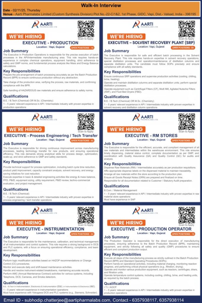 Aarti Pharmalabs Ltd – Walk-In Interviews for Multiple Departments on 2nd November 2025