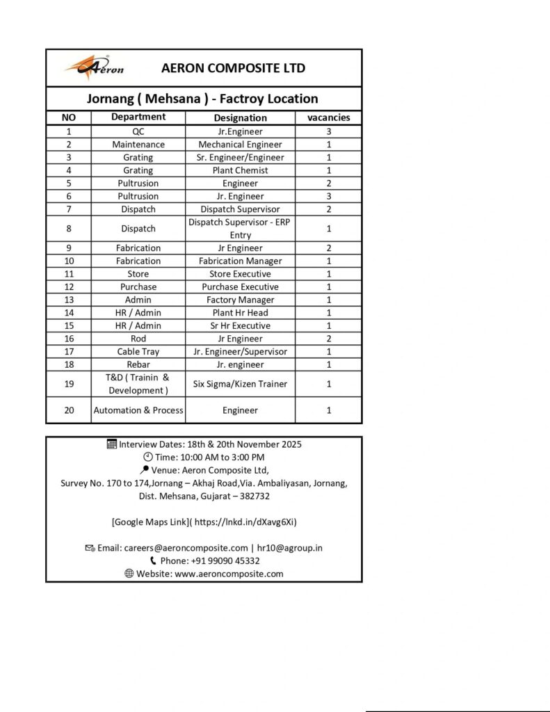 Aeron Composite Ltd is a leading manufacturer specializing in advanced composite products, engineering solutions, and structural components. With a strong footprint across major industries, the company is known for its quality standards, innovation, and modern production capabilities. Aeron Composite Ltd is now hiring for multiple technical and non-technical positions at its Jornang (Mehsana) factory location.