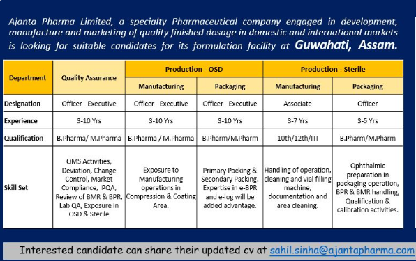 Ajanta Pharma Limited, a specialty pharmaceutical company engaged in the development, manufacture, and marketing of quality finished dosage forms in domestic and international markets, is looking for suitable candidates for its formulation facility at Guwahati, Assam.