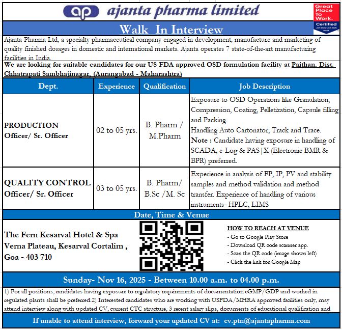 Ajanta Pharma is hiring qualified professionals for its US FDA-approved OSD formulation facility at Paithan, Chhatrapati Sambhajinagar (Aurangabad – Maharashtra).