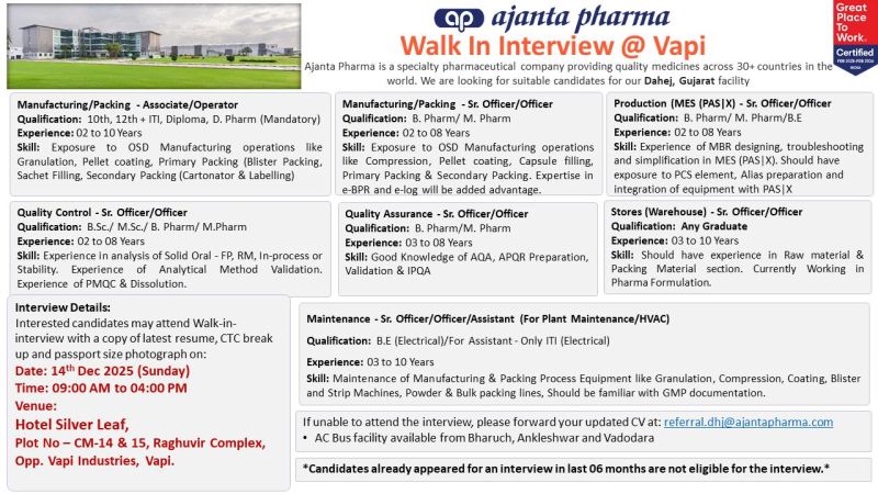 Ajanta Pharma – Walk-In Interview For Multiple Departments on 14 December 2025