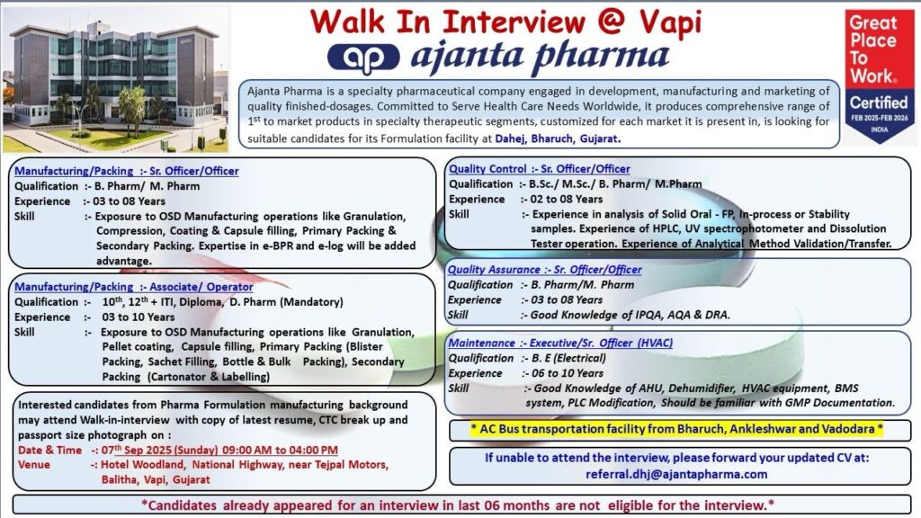 📧 If unable to attend, forward your updated CV at: referral.dhj@ajantapharma.com
