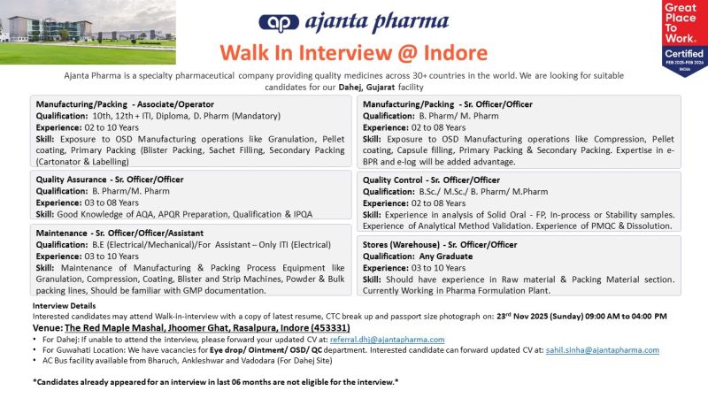 Ajanta Pharma is a specialty pharmaceutical company providing high-quality medicines to more than 30 countries across the globe. With world-class manufacturing facilities and a strong regulatory presence, the company is committed to excellence, innovation, and patient-centric healthcare solutions. Ajanta is now hiring skilled professionals for its Dahej, Gujarat facility.