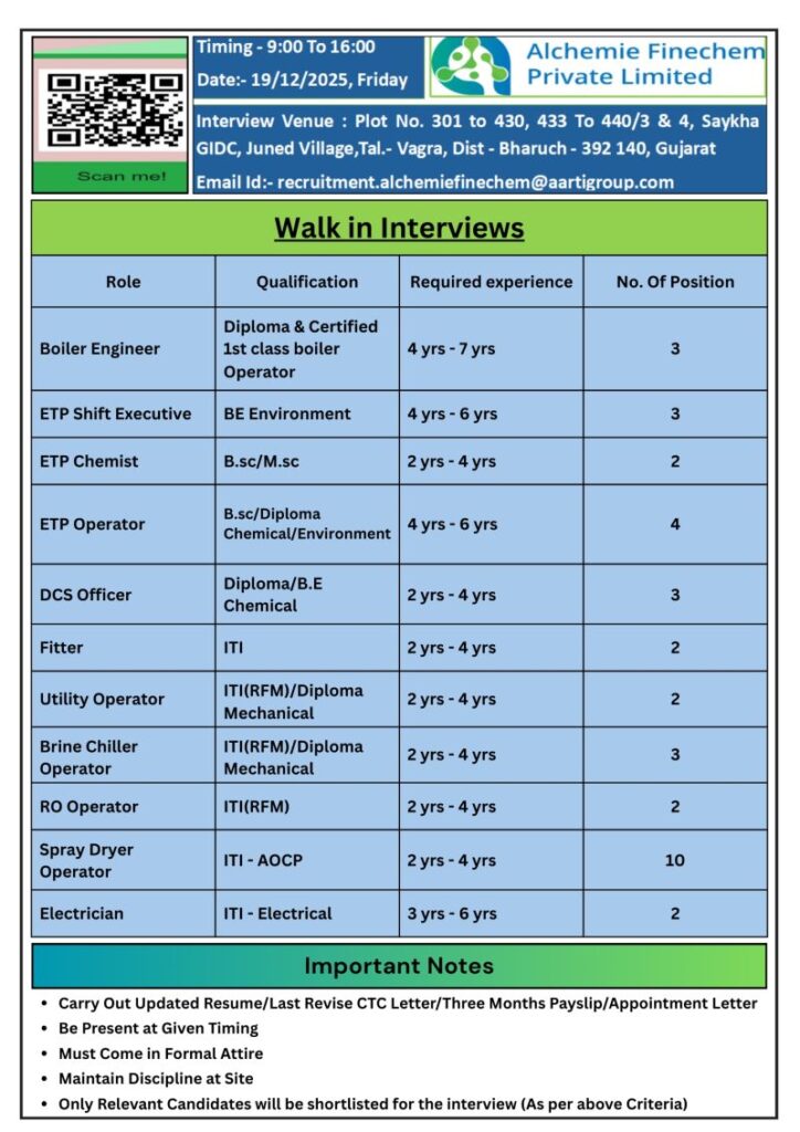 Alchemie Finechem Private Limited, part of the Aarti Group, is a well-established chemical manufacturing company with a strong focus on quality, safety, and environmental compliance. The company operates advanced manufacturing facilities and offers stable career opportunities for experienced professionals across engineering, utilities, ETP, and production operations.