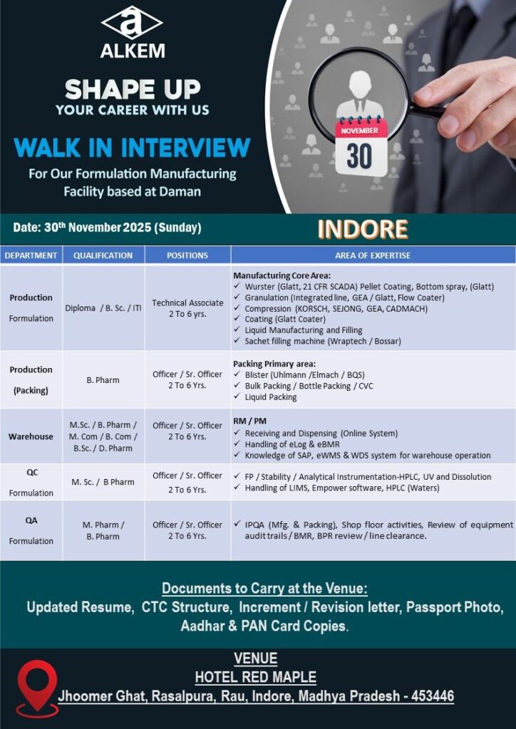 Alkem Laboratories is a leading Indian multinational pharmaceutical company known for its high-quality formulations and global presence. The company operates world-class manufacturing facilities and offers excellent career growth opportunities for skilled professionals. This walk-in drive is being conducted for positions at the Formulation Manufacturing Facility located in Daman.