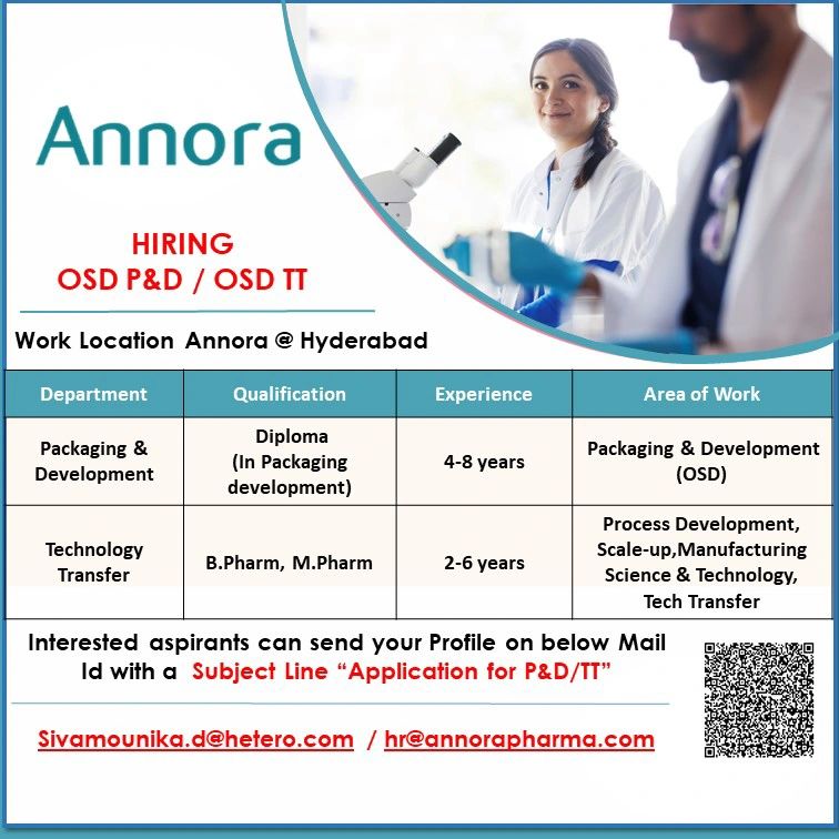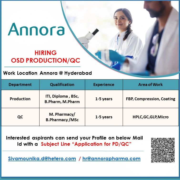 Annora Pharma is a growing pharmaceutical organization with a strong focus on high-quality Oral Solid Dosage (OSD) formulations. The company offers an excellent platform for professionals to grow in the areas of Production, Quality Control, Packaging & Development, and Technology Transfer through advanced processes, regulatory-driven practices, and a collaborative work environment.
