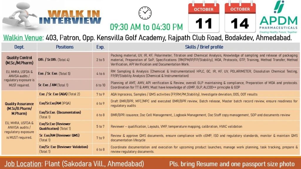 Positions: Executive / Sr. Executive / AM (IPQA, AQA, Documentation, Reviewer QMS, Reviewer Validation)