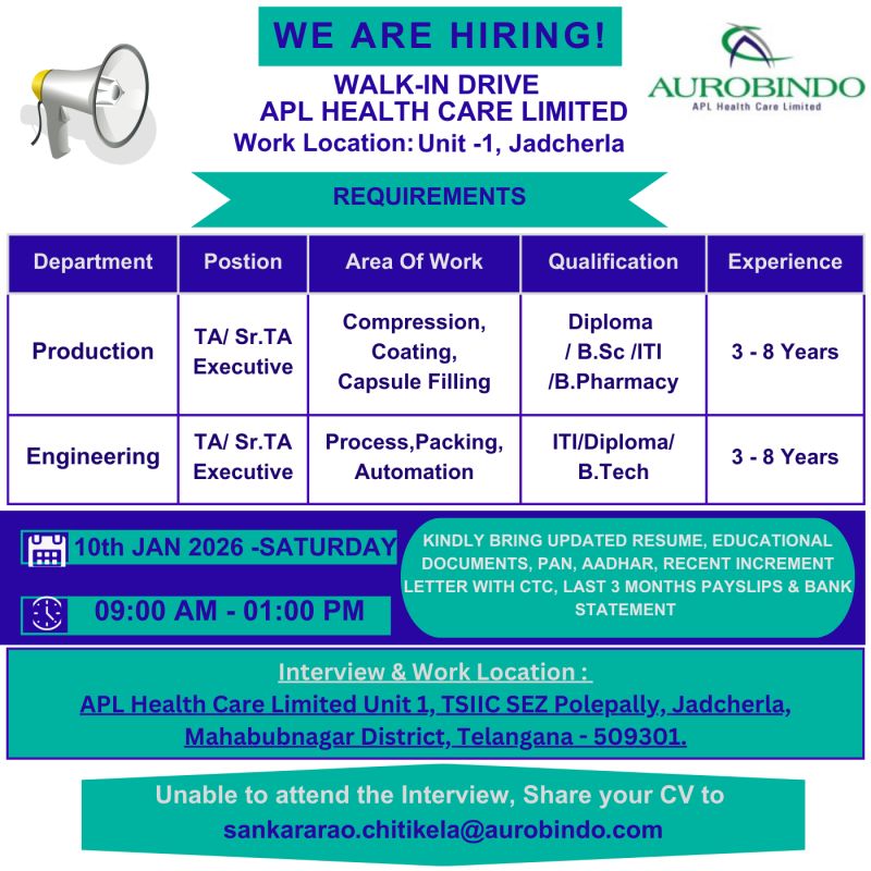 APL Health Care Limited (Aurobindo Group) is a reputed pharmaceutical company engaged in the manufacturing of high-quality formulations for domestic and international markets. The company operates modern, regulatory-compliant manufacturing facilities and offers excellent learning and career-growth opportunities for experienced professionals in Production and Engineering.