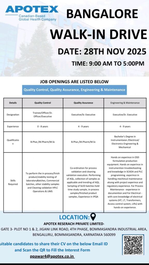 APOTEX – WALK-IN INTERVIEWS FOR QC, QA, ENGINEERING & MAINTENANCE ON 28TH NOVEMBER 2025