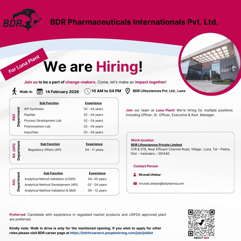 BDR Pharmaceuticals Internationals Pvt. Ltd. is a fast-growing pharmaceutical company known for its strong presence in API manufacturing and regulated market products. The company focuses on innovation, quality compliance, and global regulatory standards, offering excellent career opportunities across research, development, and analytical functions. The Luna manufacturing facility is USFDA-approved and supports global pharmaceutical markets.