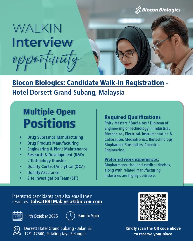 Biocon Biologics is conducting a Walk-in Interview Registration Drive for multiple positions at Hotel Dorsett Grand Subang, Malaysia.