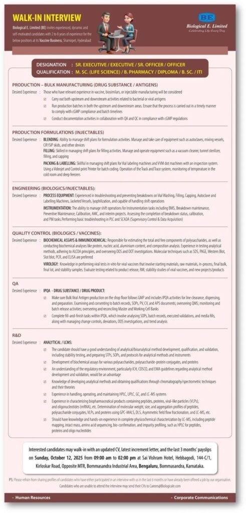 Biological E. Limited (BE) is a leading biopharmaceutical company dedicated to developing and manufacturing vaccines, biologics, and pharmaceutical products. With a strong legacy of innovation and quality, BE is inviting experienced and dynamic professionals to join its Vaccine Business unit located at Shamirpet, Hyderabad.