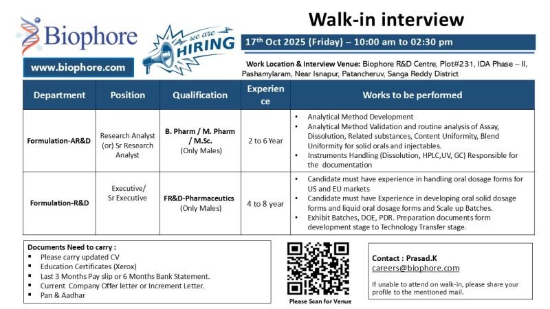 • B.Pharm / M.Pharm / M.Sc (Only Males) – for Formulation AR&D