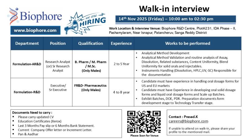 Biophore India Pharmaceuticals Pvt. Ltd. is a leading research-driven pharmaceutical organization engaged in the development and manufacturing of niche Active Pharmaceutical Ingredients (APIs) and complex formulations. The company is conducting a walk-in interview for experienced professionals at its R&D Centre in Hyderabad.