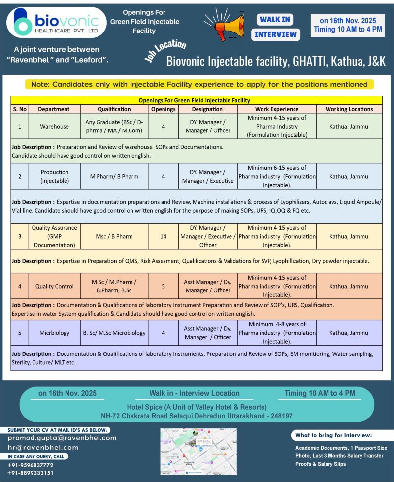Biovonic Healthcare Pvt. Ltd. is a joint venture between Ravenbhel and Leeford, dedicated to manufacturing high-quality injectable formulations. The company is establishing a Green Field Injectable Facility at Ghatti, Kathua (J&K) and is inviting experienced professionals from the Injectable Formulation sector to join its team.