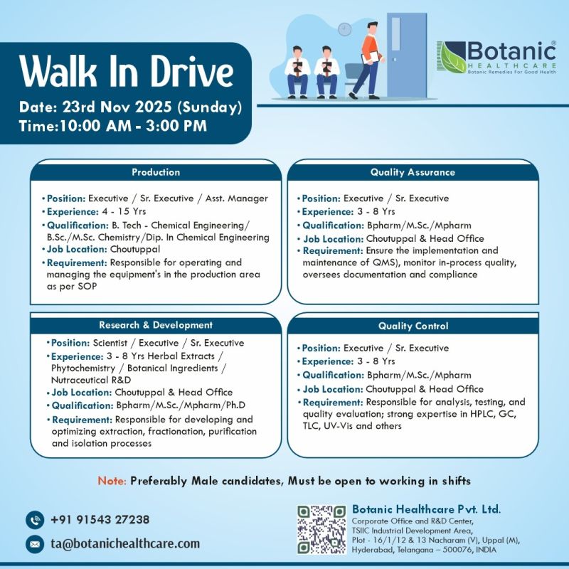 - Requirement: Analysis, testing, quality evaluation; hands-on experience in HPLC, GC, TLC, UV-Vis
