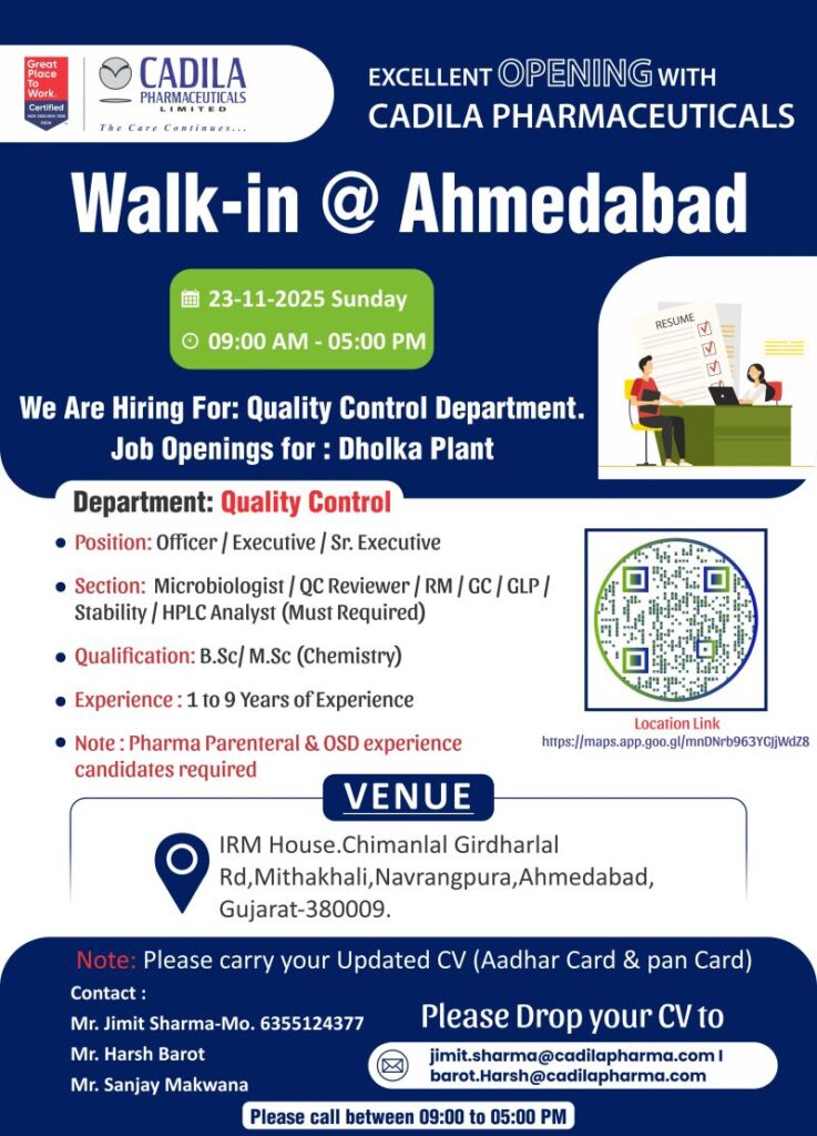 Cadila Pharmaceuticals is one of India’s largest privately held pharmaceutical companies, committed to delivering high-quality and affordable healthcare solutions worldwide. With advanced manufacturing facilities and strong global regulatory approvals, Cadila offers excellent career opportunities for skilled professionals in Quality Control, Parenteral, and OSD segments.