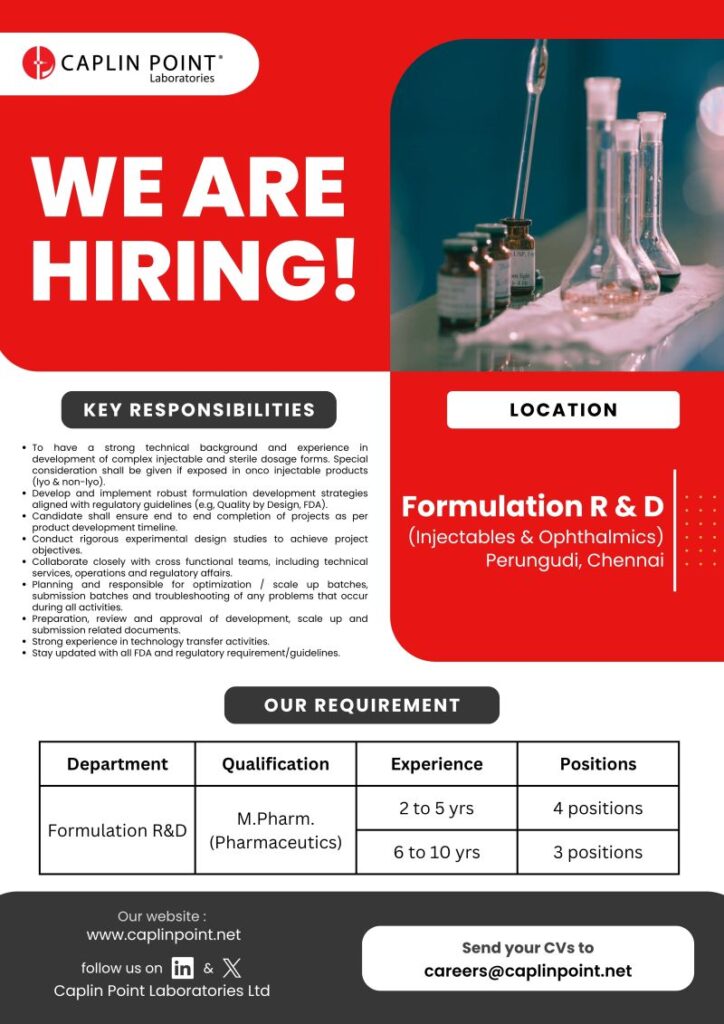 Caplin Point Laboratories Ltd is inviting applications for Formulation R&D (Injectables & Ophthalmics) at its facility in Perungudi, Chennai. The organization is known for its strong presence in sterile dosage forms and regulated market products, with continuous focus on innovation, regulatory excellence, and quality-driven development.
