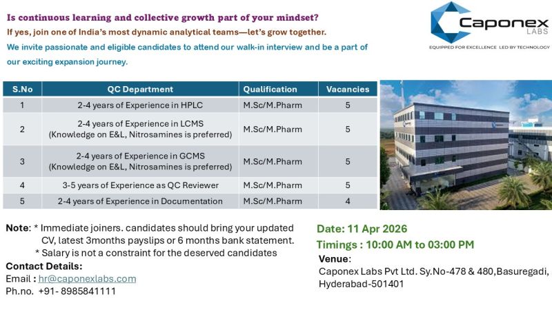 Candidates with hands-on experience in analytical instruments like HPLC, LCMS, and GCMS are highly encouraged to attend. This is an excellent opportunity to join a rapidly expanding analytical team and grow your career in the pharmaceutical industry.