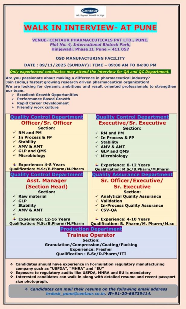 Centaur Pharmaceuticals Pvt. Ltd – Walk-in Interview for QA, QC & Production Departments on 09th November 2025