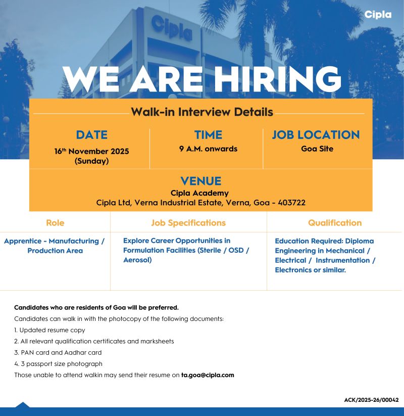 Cipla Ltd., one of India’s leading pharmaceutical companies, is offering a great opportunity for diploma engineers to explore a career in pharmaceutical formulation manufacturing. The company is conducting a walk-in interview for apprentices in the Manufacturing / Production Area at its Goa facility.