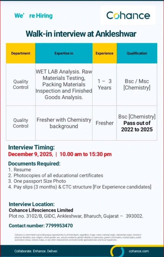 Cohance Lifesciences Ltd. is a trusted name in the pharmaceutical and life sciences sector, offering high-quality products and advanced analytical solutions. With a growing presence across India, the company focuses on innovation, operational excellence, and employee development. Cohance provides a strong platform for professionals in Quality Control to build meaningful and rewarding careers.