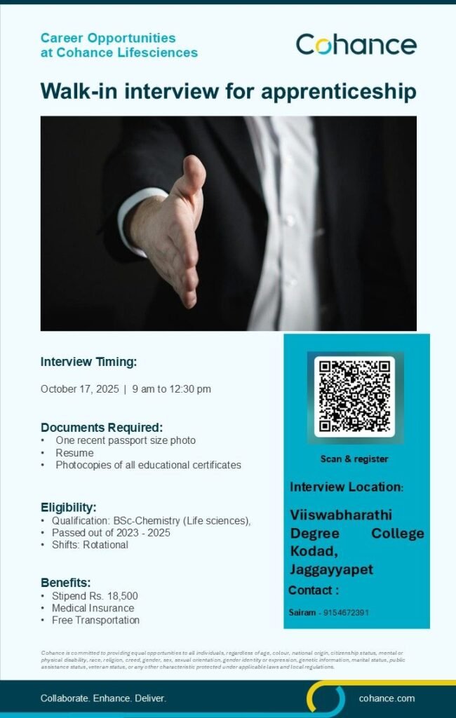 Fresh B.Sc. (Chemistry/Life Sciences) graduates are invited to attend this apprenticeship drive by Cohance Lifesciences. Don’t miss this opportunity to start your professional journey with a reputed organization.