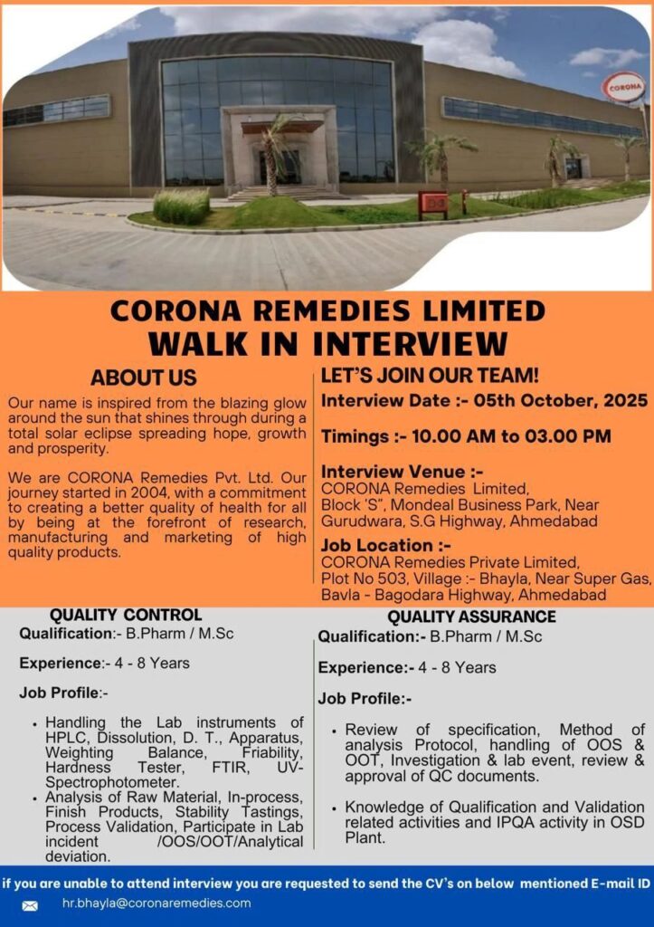 Corona Remedies Pvt. Ltd., a leading pharmaceutical company established in 2004, is committed to delivering better healthcare by focusing on research, manufacturing, and marketing of high-quality products. The company is conducting a Walk-In Interview for experienced professionals in Quality Control and Quality Assurance.