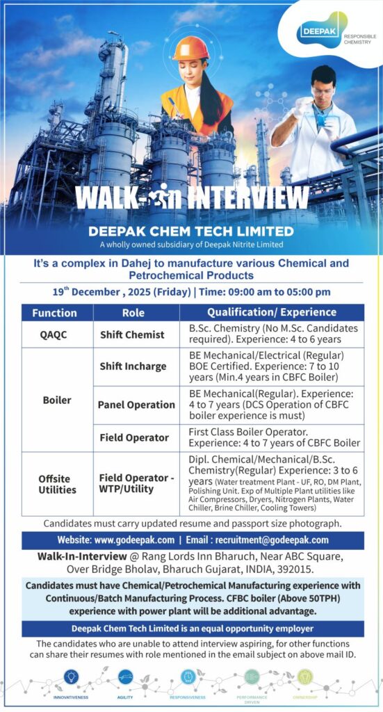 Deepak Chem Tech Limited, a wholly owned subsidiary of Deepak Nitrite Limited, is conducting a Walk-In Interview for experienced professionals at its chemical and petrochemical manufacturing complex in Dahej, Gujarat.