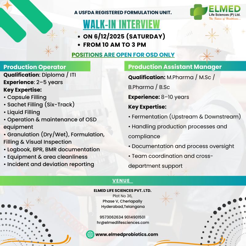 ELMED Life Sciences Pvt. Ltd. is a USFDA-registered pharmaceutical formulation company engaged in the development and manufacturing of high-quality pharmaceutical products. With a strong focus on compliance, innovation, and quality, ELMED is committed to delivering world-class formulations and maintaining global regulatory standards.
