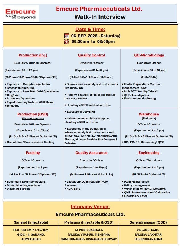Emcure Pharmaceuticals Ltd. is conducting a Walk-In Interview for multiple departments across Injectable, OSD, QC, QA, Packing, Warehouse, Engineering, and Microbiology divisions. Candidates with relevant qualifications and experience are invited to attend.