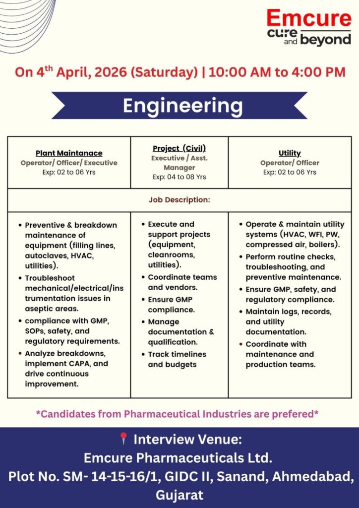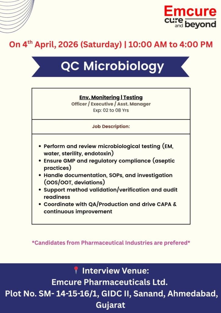 Candidates with 2โ8 years of experience in Engineering, QC Microbiology, or Production in pharma.