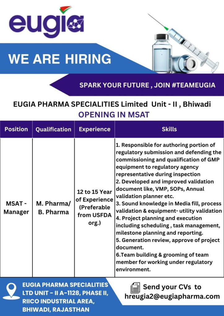 Eugia Pharma Specialities Ltd, a leading pharmaceutical organization committed to excellence in injectable and specialty formulations, is inviting applications for the position of MSAT – Manager at Unit-II, Bhiwadi, Rajasthan.