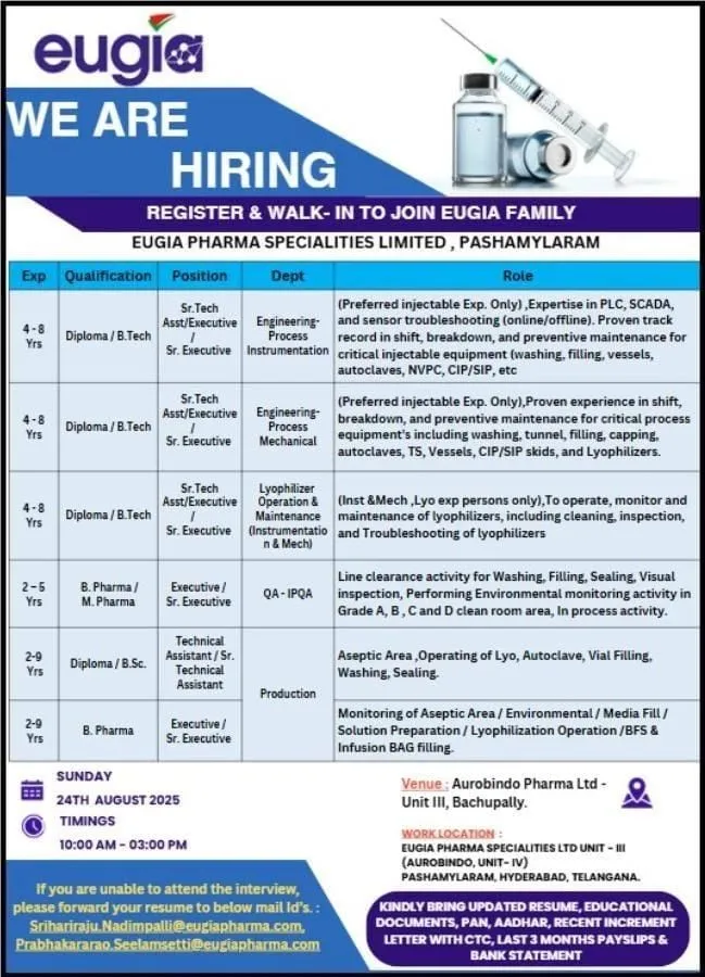 Eugia Pharma Specialities Limited is conducting a Walk-In Interview for multiple positions in different departments.