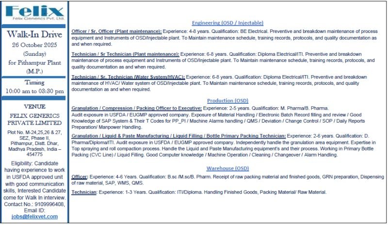Felix Generics Pvt. Ltd. invites qualified and motivated candidates to attend a Walk-In Drive for multiple positions in our Engineering, Production, and Warehouse departments at our Pithampur facility.