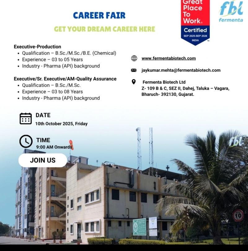 Fermenta Biotech Ltd is organizing a Career Fair for qualified professionals seeking exciting opportunities in the Pharma (API) industry.