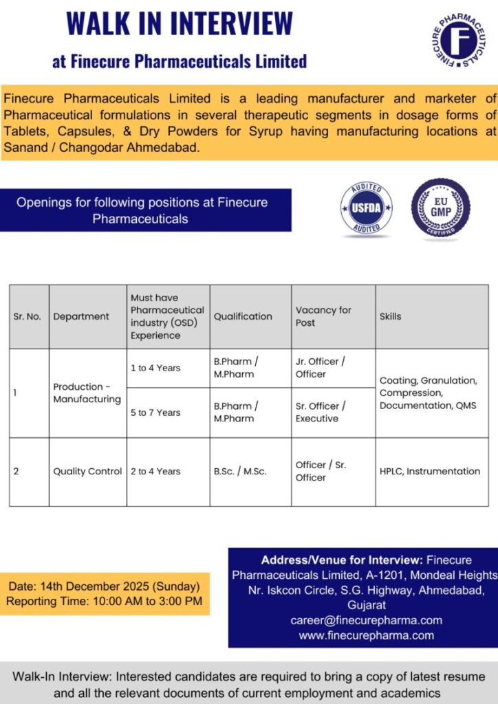 Finecure Pharmaceuticals Limited is a leading manufacturer and marketer of pharmaceutical formulations across multiple therapeutic segments. The company produces Tablets, Capsules, and Dry Powders for Syrup and operates state-of-the-art manufacturing facilities at Sanand and Changodar, Ahmedabad. Finecure is USFDA audited and EU GMP certified, ensuring high-quality and compliant pharmaceutical manufacturing standards.