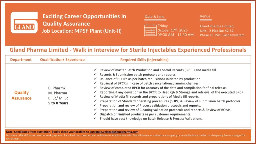 Candidates from outstation can share their profiles at Suryateja.velaga@glandpharma.com