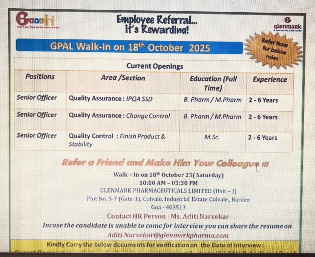 Glenmark Pharmaceuticals Limited is conducting a walk-in interview for experienced professionals in the Quality Assurance and Quality Control departments at its Goa Unit – I (Colvale) location.