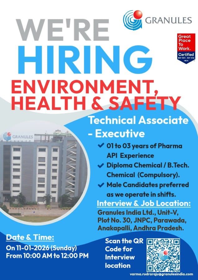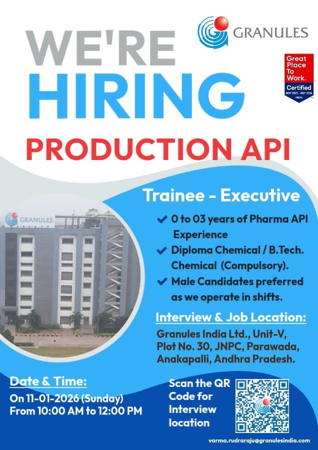 Granules India Ltd is a globally recognized pharmaceutical company specializing in API, PFI, and finished dosage formulations. The company supplies high-quality pharmaceutical products to leading markets worldwide and is known for its strong manufacturing capabilities, regulatory compliance, and employee-centric work culture. Granules India is also a Great Place to Work Certified organization, offering excellent career growth opportunities in the pharma API segment.