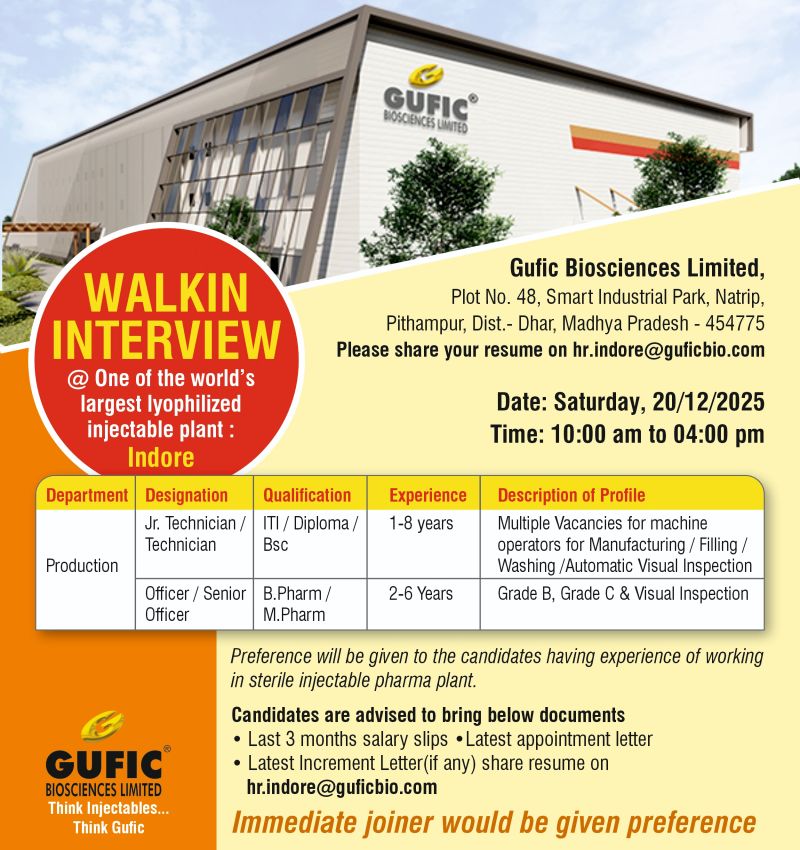 Gufic Biosciences Limited is one of the worldโs largest lyophilized injectable manufacturing companies, known for its advanced technology and sterile injectable capabilities. The company continues to expand its operations and invites skilled professionals to join its team at its state-of-the-art facility located in Indore.