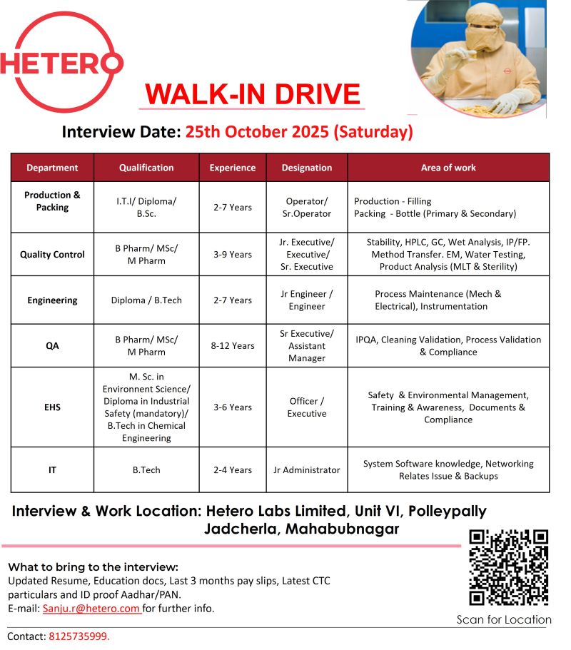 Hetero Labs Limited, a leading pharmaceutical company, is conducting a Walk-in Drive for various departments including Production, Quality Control, Engineering, QA, EHS, and IT at its Jadcherla facility. The company invites skilled professionals with relevant experience in pharmaceutical manufacturing and quality operations.