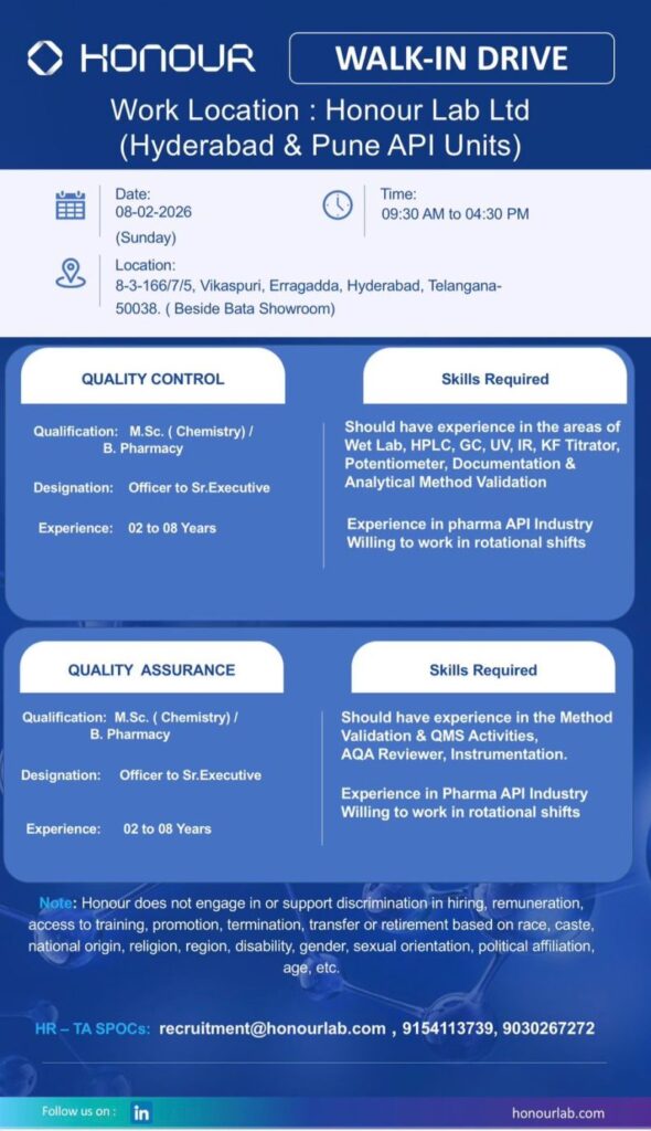 Honour Lab Ltd – Walk-In Interview For Multiple Departments on 08 February 2026