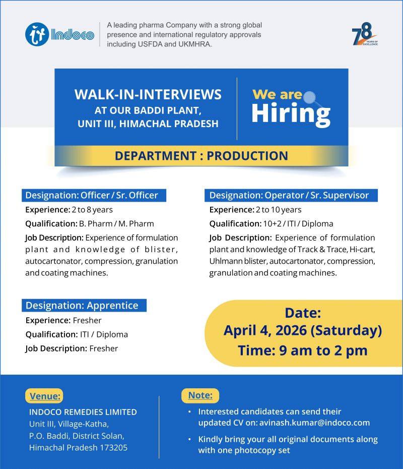 - You can also share your updated CV at: avinash.kumar@indoco.com