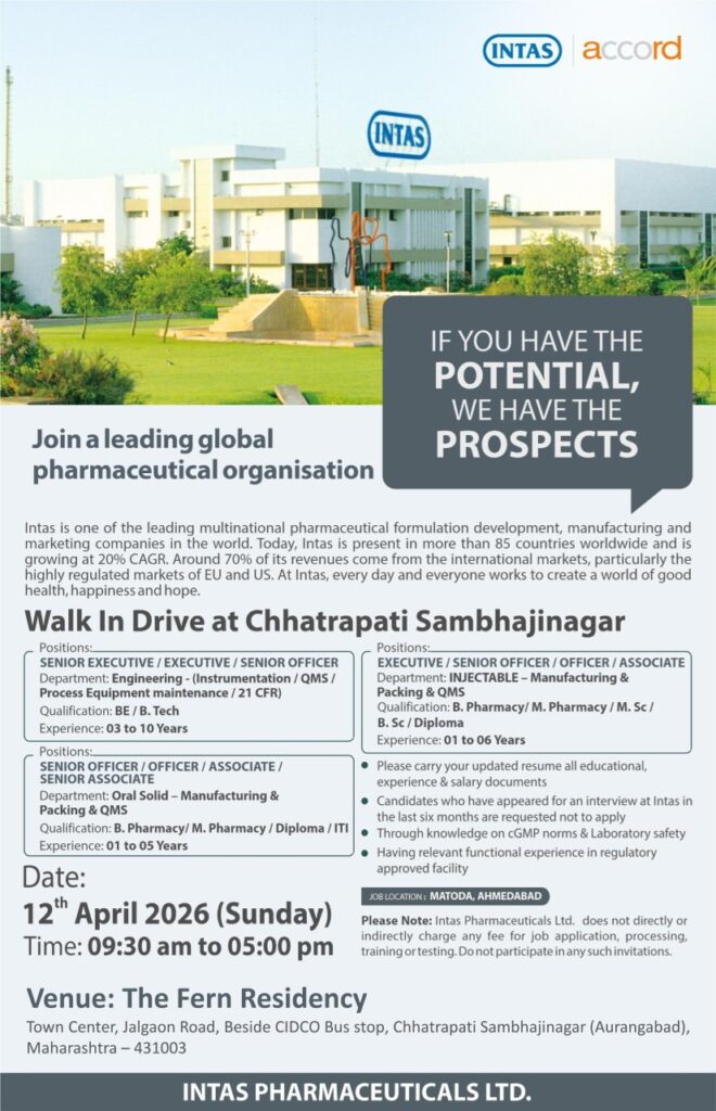 - Intas Pharmaceuticals Ltd. does not charge any fee for job applications or interviews