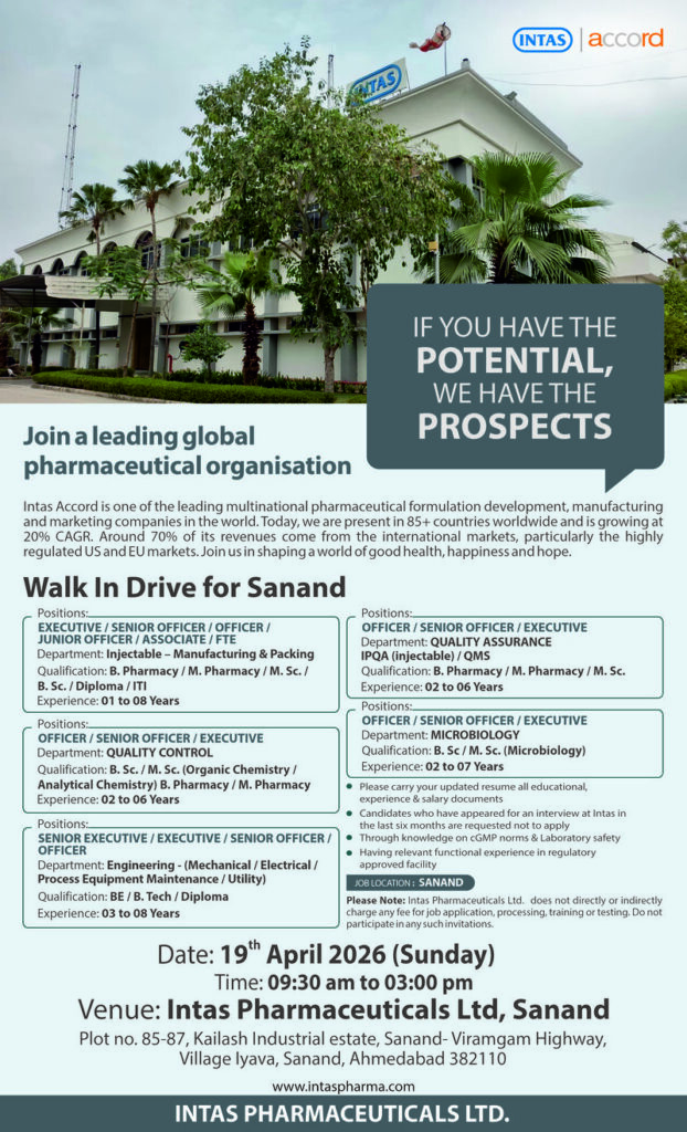 Intas Pharmaceuticals is conducting a walk-in drive for multiple departments at its Sanand facility. Candidates with relevant pharmaceutical experience and qualifications are invited to attend and explore career opportunities in manufacturing, quality, microbiology, and engineering functions.