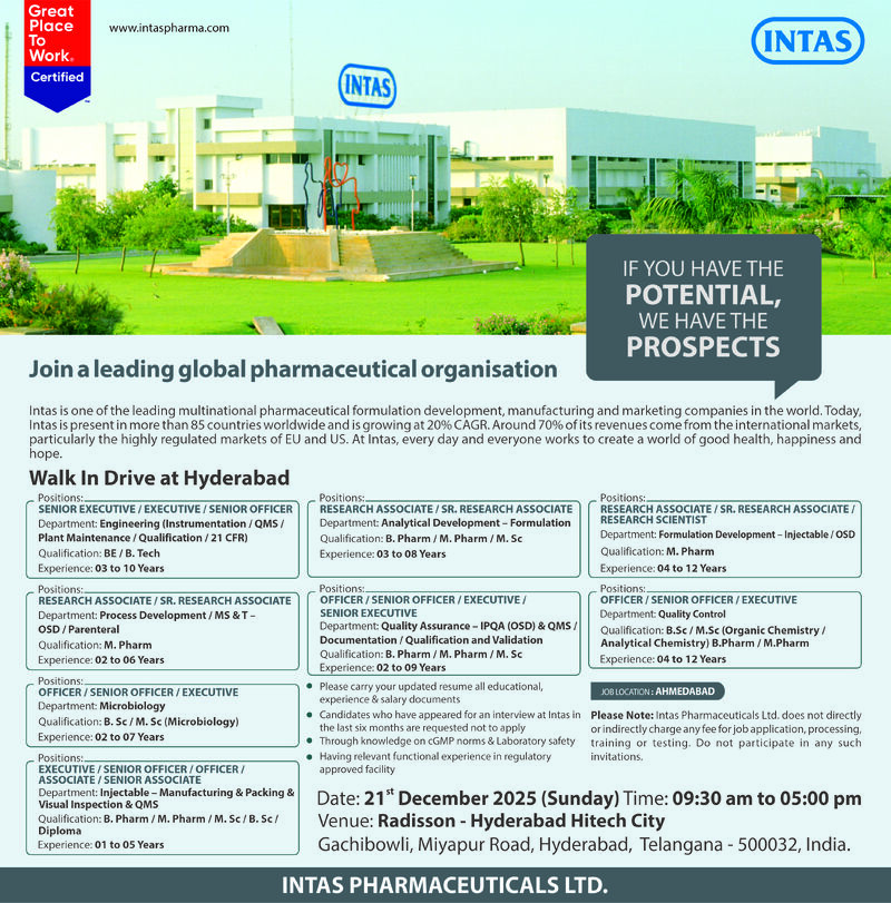 Intas Pharmaceuticals Ltd does not charge any fees for job applications, processing, training, or testing. Candidates are advised to remain cautious of fraudulent recruiters demanding payments.