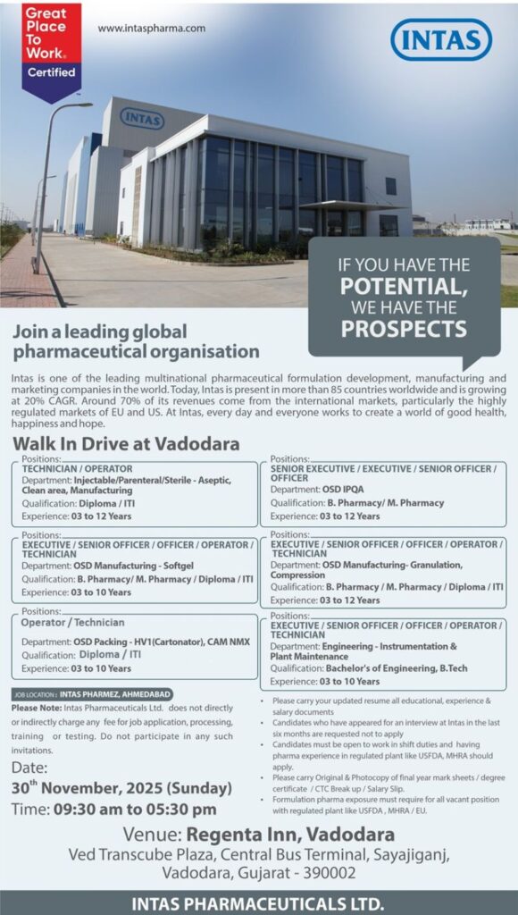 – Candidates who appeared for an Intas interview in the last 6 months are not eligible
