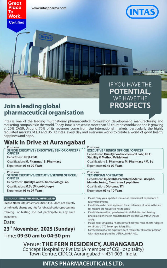 Intas Pharmaceuticals Ltd., a leading global pharmaceutical organization, is conducting a Walk-in Drive for experienced professionals at its Aurangabad venue.