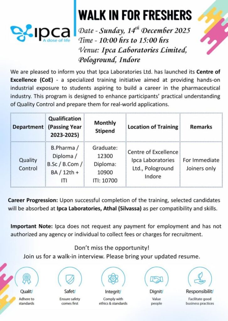 Ipca Laboratories Limited is a globally recognized pharmaceutical company known for its strong presence in formulations and APIs across multiple therapeutic segments. Ipca operates world-class manufacturing facilities approved by major regulatory authorities and is well known for its commitment to quality, safety, integrity, and skill development. Through its Centre of Excellence (CoE), Ipca actively trains fresh talent for real-world pharmaceutical industry exposure.